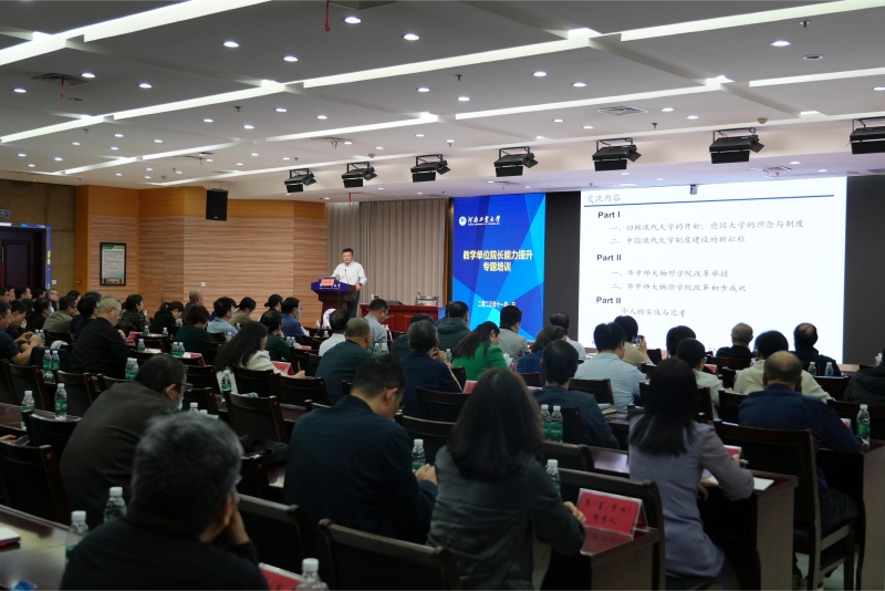 开班仪式结束后,全体教学单位院长、副院长、系(教研室、实验中心)负责人、发展规划处、科技处、社会科学处、研究生院、学科建设办公室全体人员共同聆听了河南师范大学副校长杨亚东教授的专题辅导报告《现代大学的学院改革与探索》。杨亚东教授曾任华中师范大学物理科学与技术学院常务副院长和科研部部长、科技处处长、科发院院长、军工办主任;郑州大学研究生院常务副院长,具有丰富的二级学院管理和改革经验。他从德国大学的理念和制度切入回顾了现代大学的开始,又以华中师范大学物理学院改革试点为例,讲授了我国现代大学制度建设的经验,最后从加快学科建设、实现内涵发展的目标出发,以学科与乐鱼online(中国)、学科与学科、学科与学院、学科与学人的四种关系,深度阐述了加强基础学科在大学发展中的重要性。他的报告立足国际视野、内容丰富、站位深远,对乐鱼online(中国)加快校院两级改革、凝练学科方向、实现内涵发展等方面具有重要的指导意义。
