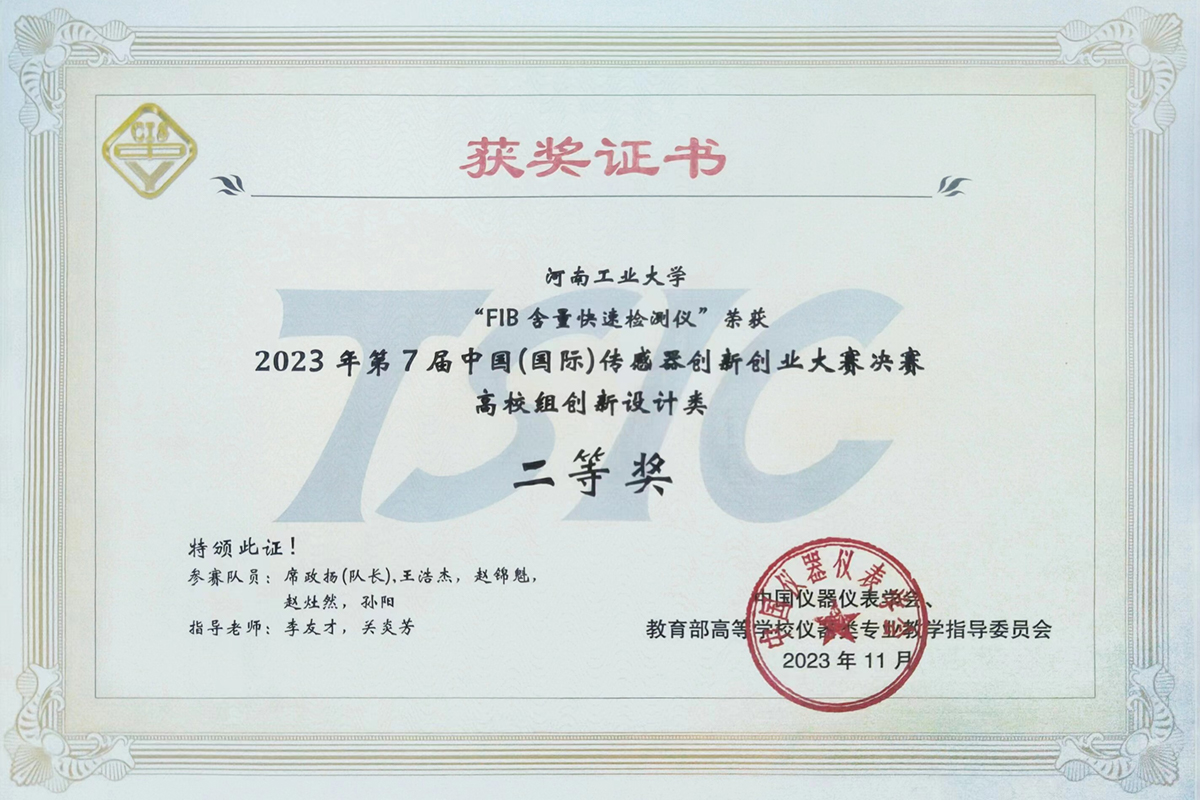 11月6日,作为2023世界传感器大会分项目的第7届中国(国际)传感器创新创业大赛决赛在郑州国际会展中心落下帷幕。我校机电工程学院机械设计制造及其自动化专业席政扬、王浩杰、赵锦魁、赵灶然和孙阳五名同学组成的“FIB含量快速检测仪”团队在关炎芳和李友才两位导师的带领下,经过激烈角逐,从全国97个决赛队伍中脱颖而出,荣获高校组创新设计类国赛二等奖。