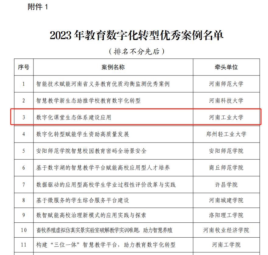 近日,河南省教育厅发布了《河南省教育厅办公室关于公布2023年教育数字化转型优秀案例的通知》(教办科技〔2023〕402号),我校申报的《数字化课堂生态体系建设应用》项目成功获评河南省教育数字化优秀案例。