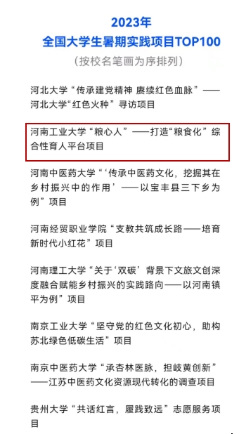 11月10日,“2023年第九届全国大学生暑期实践展示活动”名单揭晓,经过遴选、展示、评审等环节,我校“粮心人”——打造“粮食文化”综合性育人平台项目入选“2023年全国大学生暑期实践项目TOP100”。
