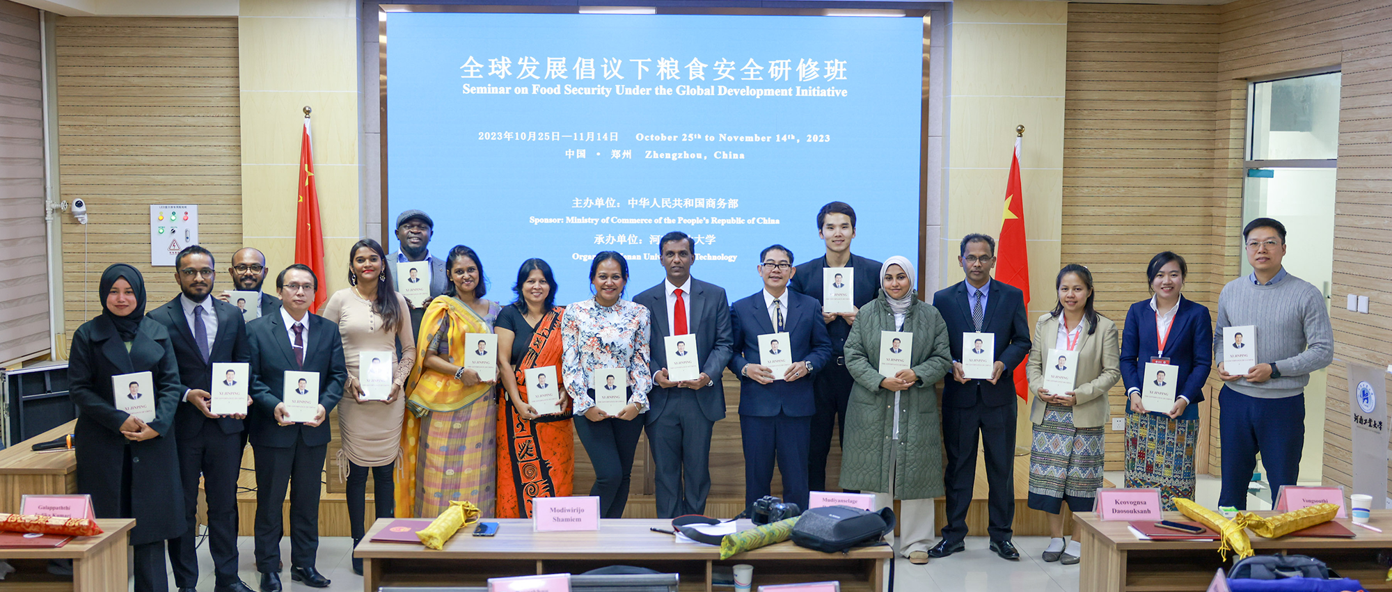 近日,由中华人民共和国商务部主办、河南工业大学承办的“全球发展倡议下粮食安全研修班”在我校顺利举办。来自马尔代夫、老挝、苏里南、蒙古、卢旺达、斯里兰卡6个国家的16名粮食行业的官员专家参与了研修项目。结合当前全球粮食领域面对的共同问题,以及与会学员的具体需要,研修班在21天里精心筹备了课堂讲座、研讨交流、参观考察、现场教学和文化体验等环节。