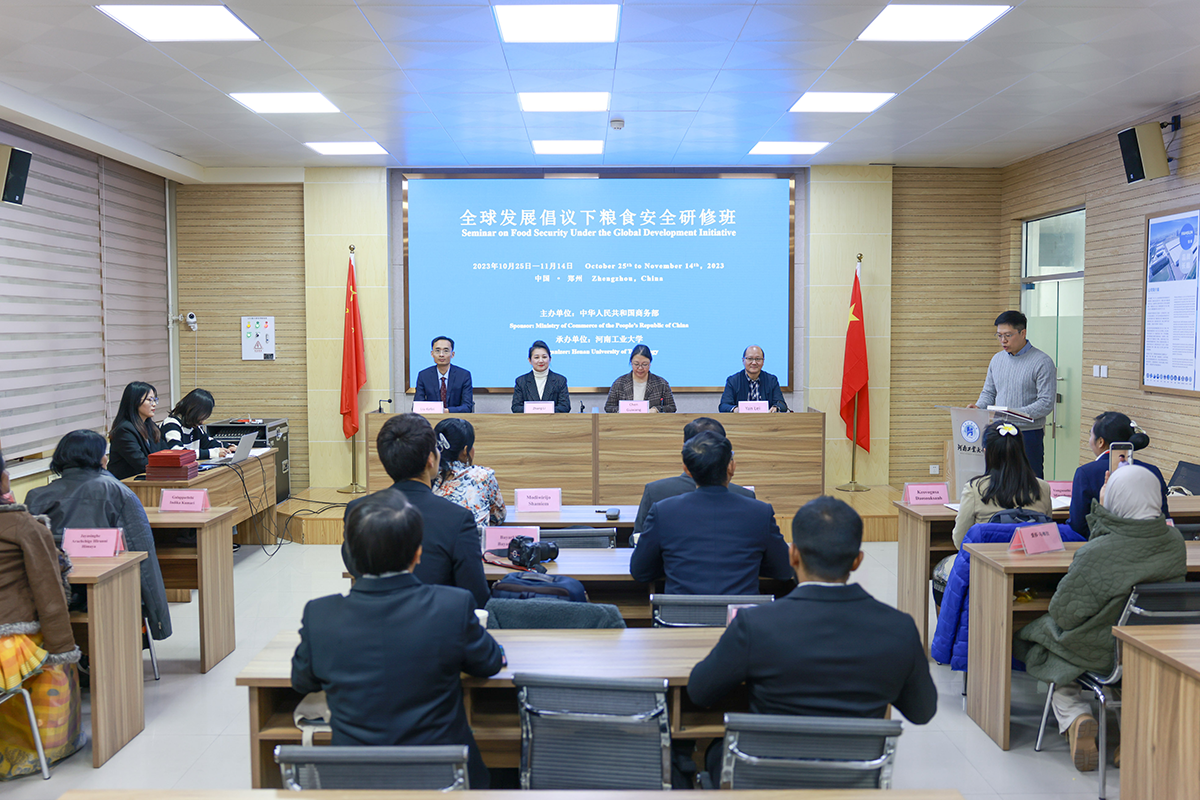 10月25日,河南工业大学国际交流与合作处处长张莉、河南工业大学粮食和物资储备学院副院长阎磊、教育培训学院院长刘克非、副院长沈贞以及来自发展中国家的16名学员共同出席了开班仪式。