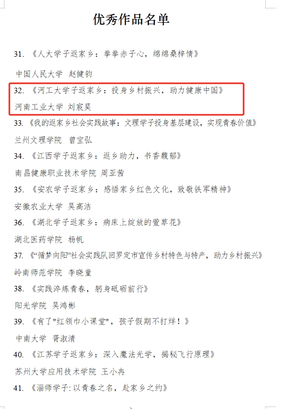 近日,由团中央青年发展部、中国青年报、中国青年网共同举办的2023年“我的返家乡实践故事”征集活动结果揭晓。经过报名审核、作品发布、网络展示、综合评审等环节,我校作品《河工大学子返家乡:投身乡村振兴,助力健康中国》荣获优秀作品,全国仅50个。