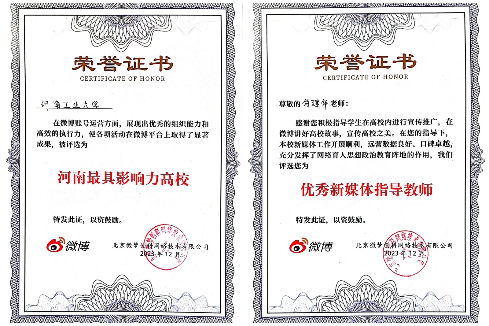 12月2日,2023年微博校园河南渠道高校新媒体交流会在河南农业大学龙子湖校区举行。会上官方颁布了2023年度“微博校园河南最具影响力高校”和“微博校园河南优秀新媒体指导教师”等奖项。河南工业大学官方微博荣获2023年度“微博校园河南最具影响力高校”,符建华荣获2023年度“微博校园河南优秀新媒体指导教师”。