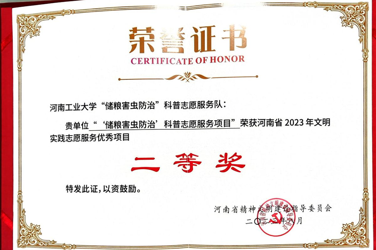 近日,收到上级通知,我校宣传部指导、粮食和物资储备学院组织的“储粮害虫防治”科普志愿服务队获“河南省2023年文明实践志愿服务项目”二等奖。这是我校首次在该活动中上取得突破。