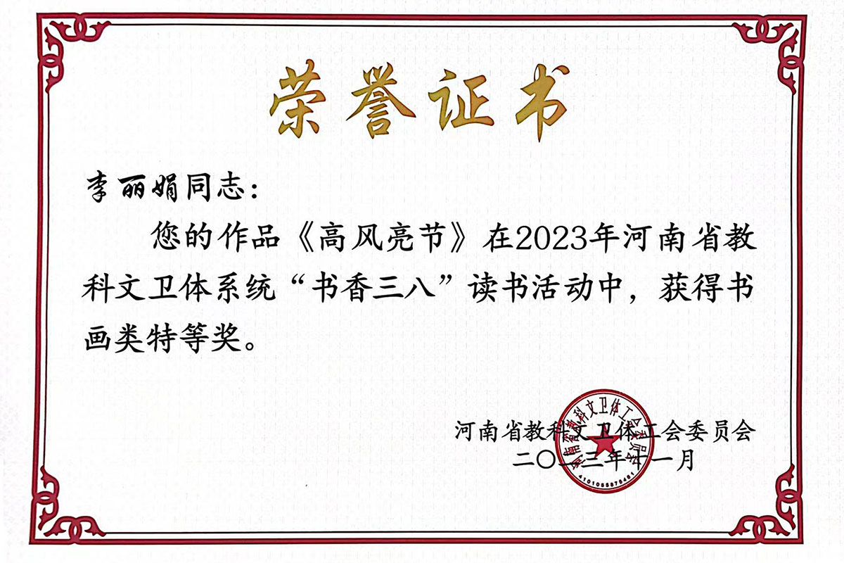 近日,河南省教科文卫体工会公布了2023年“阅读新时代•铸就新辉煌”“书香三八”读书活动获奖情况。在全系统的657件作品中,我校共有14件获奖,化学化工学院李丽娟荣获书画类特等奖。