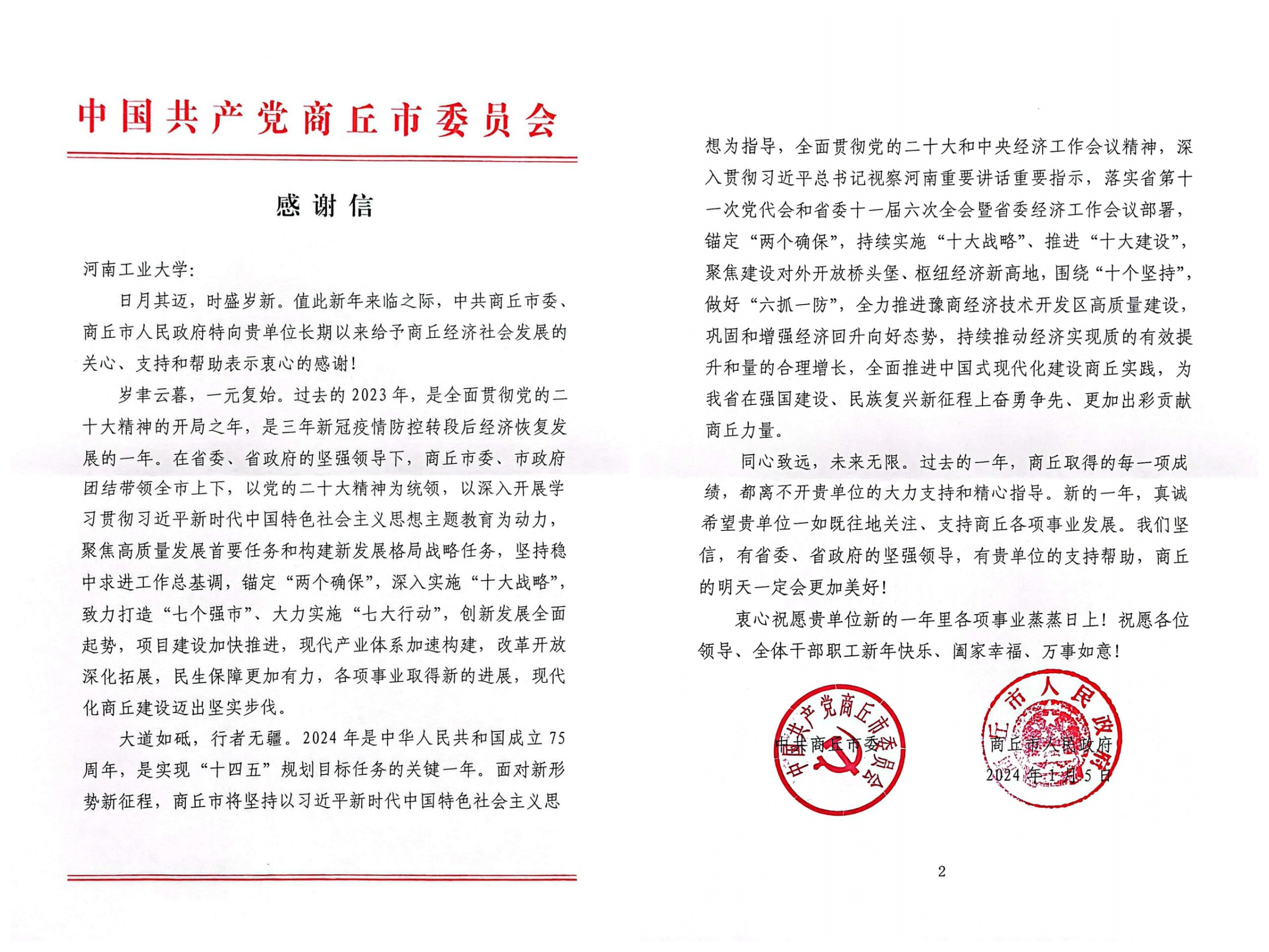 信中指出,商丘市在省委、省政府的坚强领导下,聚焦高质量发展首要任务和构建新发展格局战略任务,创新发展全面起势,取得了一系列成效,对我校的大力支持和帮助指导表示了诚挚的感谢,希望我校新的一年一如既往地关注、支持商丘各项事业发展,并为校领导、全体干部职工送上诚挚祝福。
