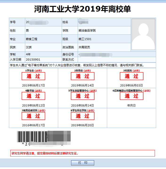 3.毕业生个人登录系统(用户名、密码均为学号),查看各单位审核情况。全部项目审核通过的,即可在线打印离校单(见附图离校单样例)交至学院,完成离校手续。“未审核”或“未通过”的项目,请及时到相应单位进行处理。