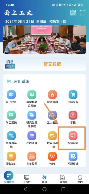 在苹果应用商店或安卓应用市场中搜索“云上工大”APP或扫描二维码下载,在登录页点击“新生登录”,以新生身份登录,输入账号和密码,在“应用系统”首页中点击“智慧迎新”(如图3)。