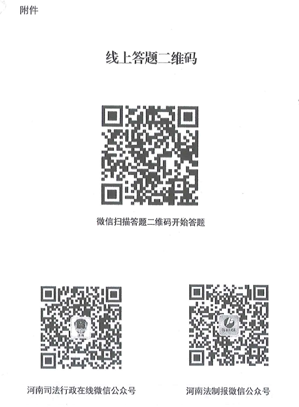 登录“河南司法行政在线”“河南法制报社”微信公众号二维码(见附件),点击下方“知识竞赛”即可进入答题页面,竞答者需要填写姓名、单位、地区、手机号等信息后开始答题。