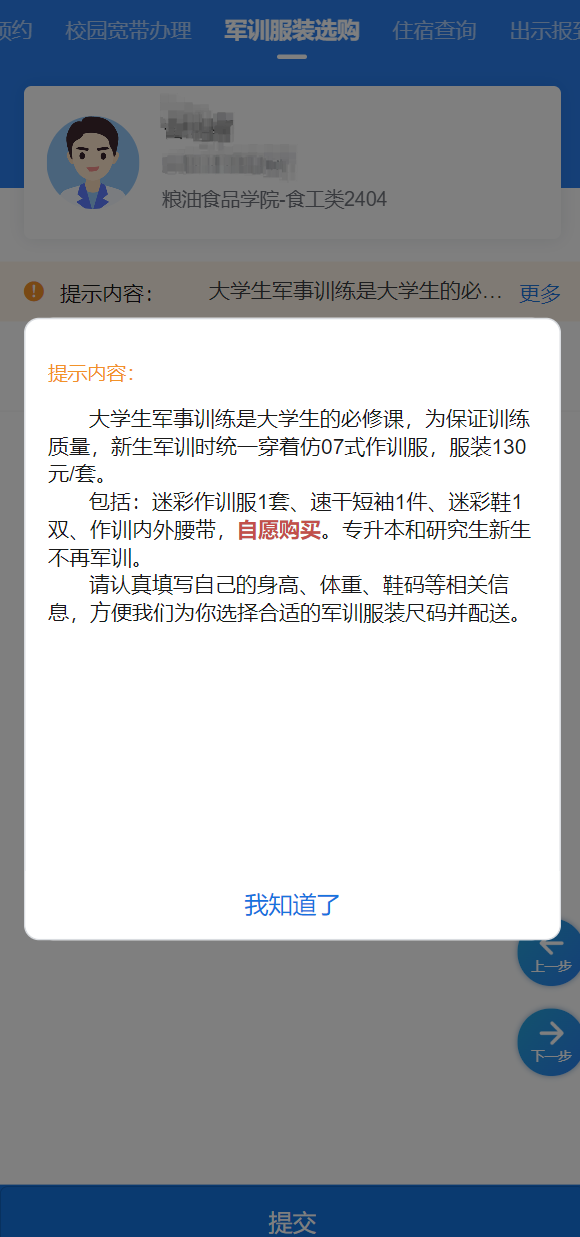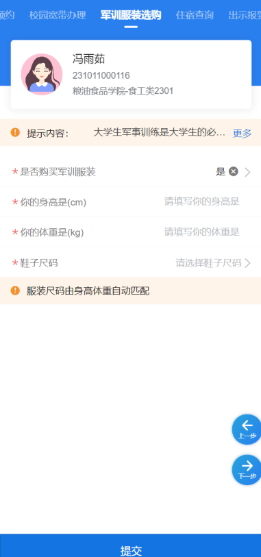 学生可以提前选择军训服装(如图15),填写身高、体重和鞋子尺码,服装尺码由服装厂商根据所填写的身高体重匹配。新生根据自身情况自愿选购。