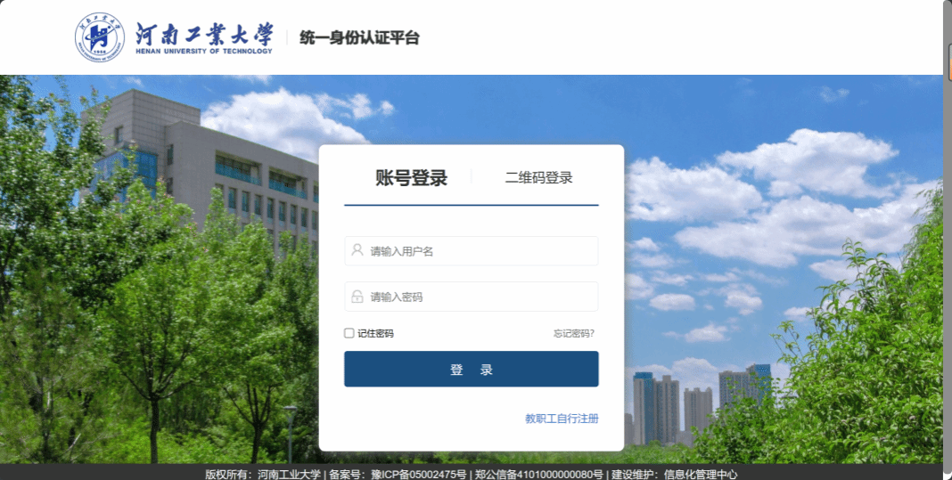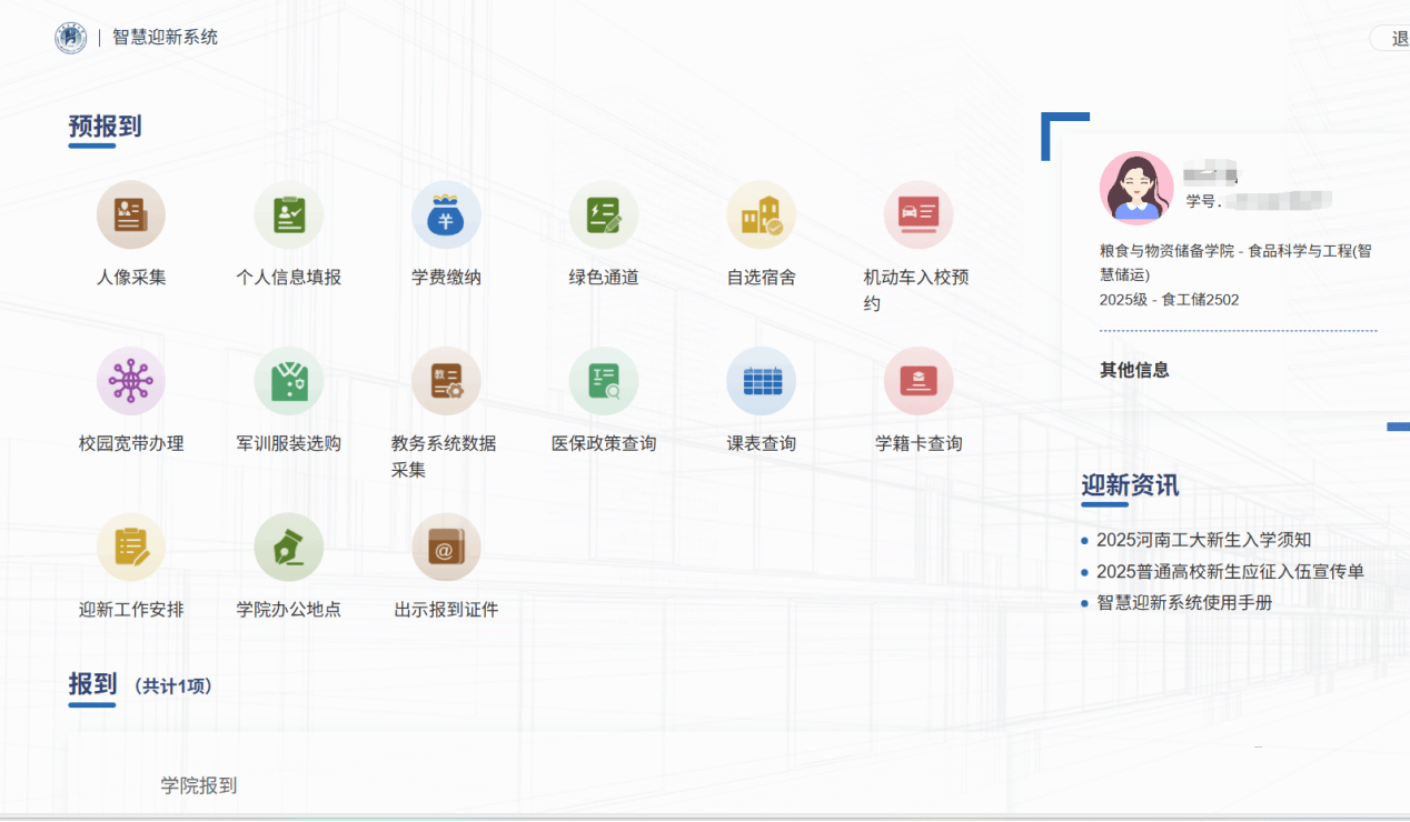 或者访问河南工业大学官网首页,点击“智慧迎新”,进入系统登录界面(如图2),输入账号和密码,进入智慧迎新系统操作主界面。