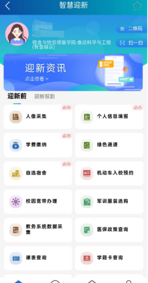 在苹果应用商店、鸿蒙应用市场或安卓应用市场中搜索“云上工大”APP或扫描二维码下载,在登录页点击“新生登录”,以新生身份登录,输入账号和密码,在“应用系统”首页中点击“智慧迎新”(如图3)。
