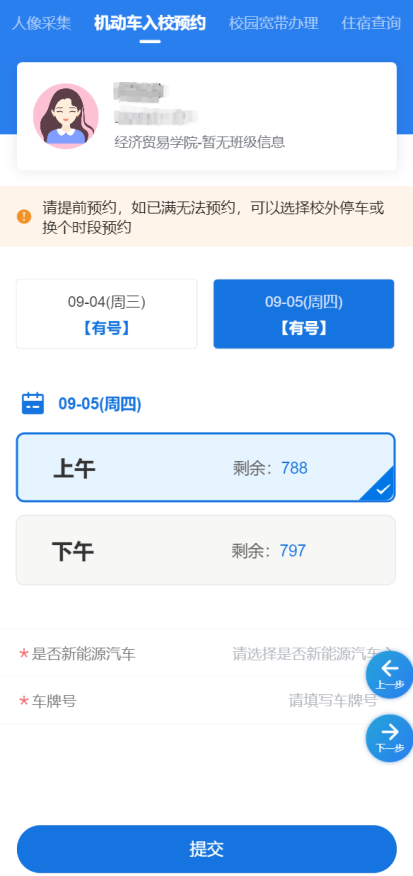 为保证校内交通秩序和教学秩序,机动车进入校区需要预约(如图13),学生根据自身情况选择是否预约。如预约时段已满,请自主在校外停车。