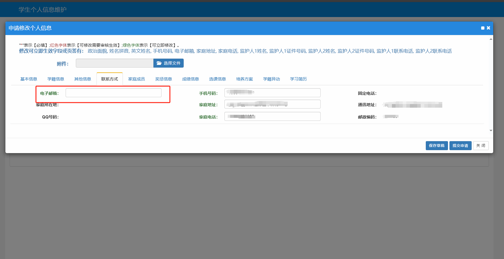 对话框有卡片可以切换,本次在基本信息、其他信息、联系方式三个选项卡中会有必填项需要填写,每个卡片中所有带红色*的选项都是必填项,各位学生请将所有必填项完成填写。