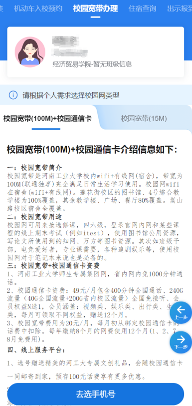 学生可以提前办理校园宽带及校园通讯卡(手机卡),办理时请仔细阅读相关资费标准(如图14),学生根据自身情况选择是否办理以及选择相应校园网套餐类型。校园宽带及手机通信卡均为自愿购买,不购买不影响正常报到。为有效防范电信诈骗,保障各位新生的财产安全与信息安全,建议新生优先通过迎新系统办理校园通信卡和校园宽带。