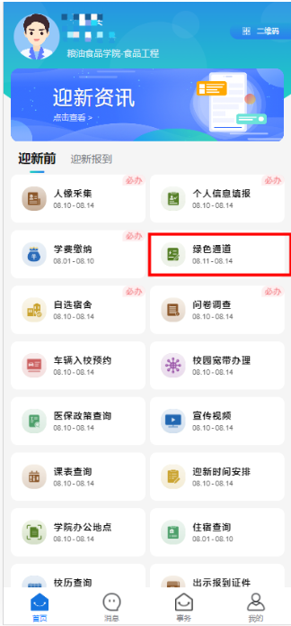 (1)点击移动智慧迎新首页“绿色通道”(如图8);