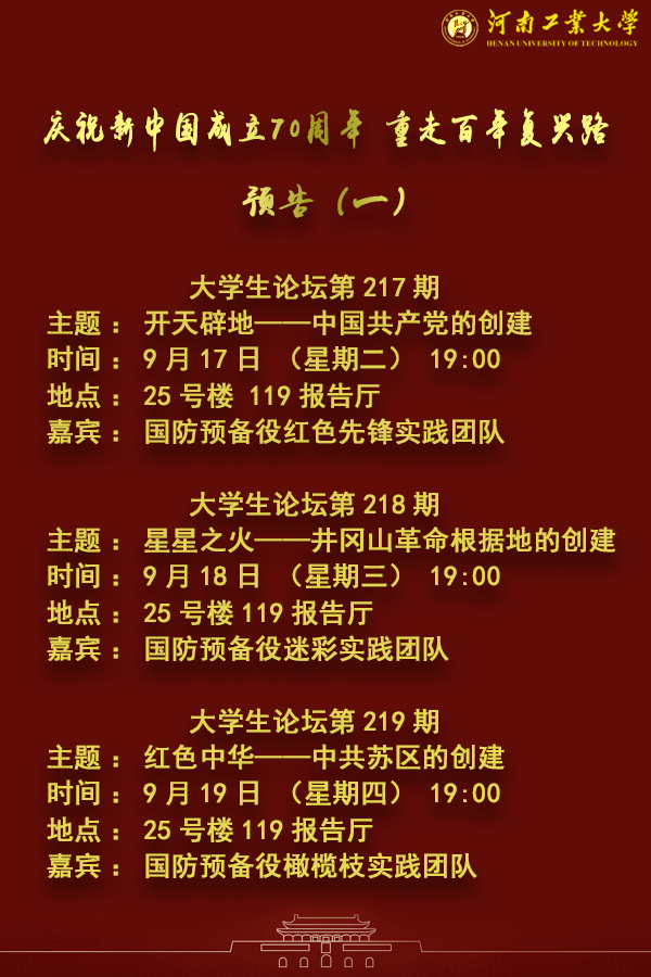 为庆祝中华人民共和国成立70 周年,结合乐鱼online(中国)“重走百年复兴路,担当时代新使命”专项暑期社会实践活动和“不忘初心、牢记使命”主题教育,乐鱼online(中国)党委学工部、武装部、校团委联合各学院举办大学生论坛“庆祝新中国成立70周年重走百年复兴路”系列宣讲活动,从而引导青年学生深入学习理解百年以来中华民族发起五四运动、建立中国共产党,在中国共产党领导下进行新民主主义革命、建立新中国、建设新中国、推动改革开放、走进新时代的伟大实践,在重温历史中受到教育,坚定理想信念,把爱国情、强国志、报国行融入新时代追梦奋斗实践中,以实际行动庆祝中华人民共和国成立70周年。