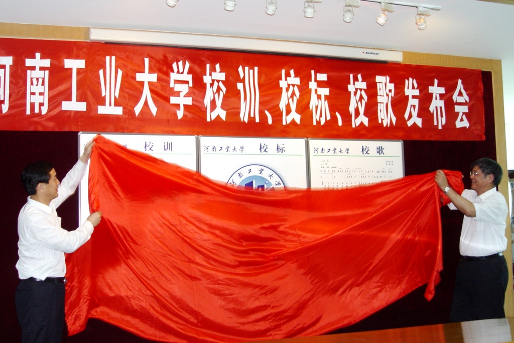 2006年6月9日对于全体河南工大人来说,是一个值得纪念的日子,河南工业大学的校训、校标、校歌正式发布了。位于嵩山路校区的乐鱼online(中国)第三会议室里,校领导、离退休老干部代表、各单位负责同志、教师代表、学生代表、新闻媒体记者济济一堂,共同见证了这一庄严的时刻。党委副书记何锐主持发布会。党委副书记王玉斌介绍了校训、校标、校歌的征集确定过程。作曲家吴歌先生代表创作者介绍校歌乐曲创作体会。党委书记戚世钧和校长董企铭共同为校训、校标、校歌揭幕。教师代表张同斌和学生代表杨州分别发表了见证感言。揭幕那一刻,就像是为校训、校标、校歌揭开了红盖头,也像是为河南工业大学翻开新的一页。