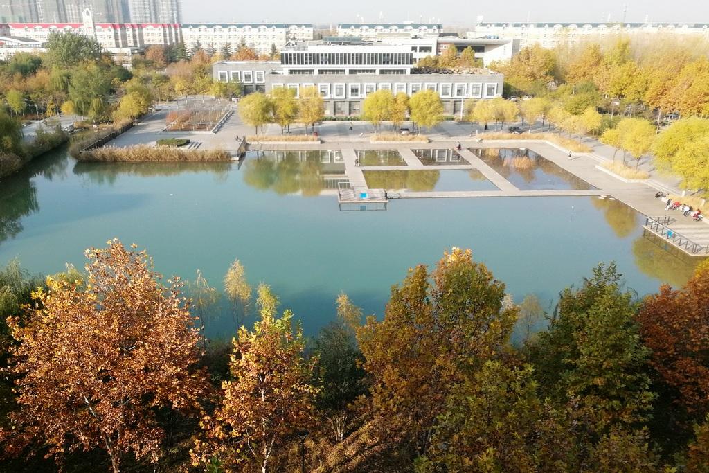 莲景比不过曲岸的湖面大,却为湖面添加了俏丽。莲水相依,仿佛目不交睫地传情。湖面碧波荡漾,明静另带柔爽,让你“近水楼台先得月”。一湖之隔,办公教学区在前,学生宿舍群在后,水上金桥成了求知者的必经之路,联通着成功的彼岸。自然的,莲湖和育人成龙有了情结,河南工大人的设计伏笔露了真迹。