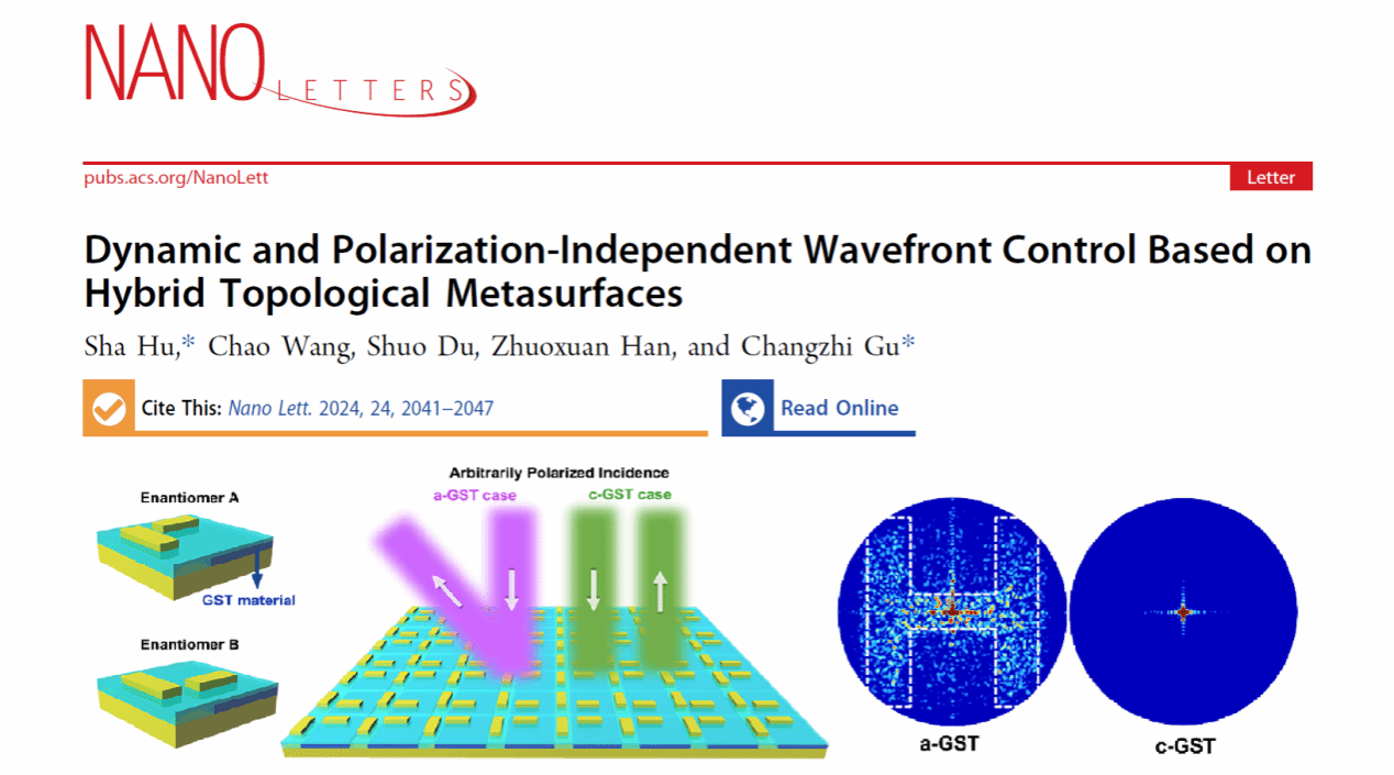 近日,我校理学院青年教师胡莎博士在纳米科技领域国际顶级期刊《Nano Letters》(中科院一区TOP,IF = 10.8)上发表了题为“Dynamic and Polarization-Independent Wavefront Control Based on Hybrid Topological Metasurfaces”(DOI: 10.1021/acs.nanolett.3c04621)的研究型论文。胡莎博士为论文的第一作者和第一通讯作者,中科院物理所顾长志研究员为共同通讯作者,河南工业大学为第一署名单位和第一通讯单位。