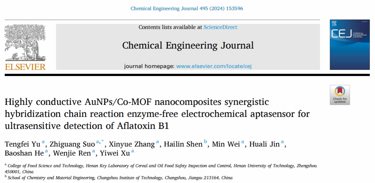 近日,我校粮油食品学院的现代营养食品创制及安全检测团队索志光博士报道了基于无酶扩增和AuNPs/Co-MOF电化学适配体传感器用于黄曲霉毒素B1的检测的最新研究成果。该成果发表在工程技术类TOP期刊Chemical Engineering Journal(影响因子:13.3),河南工业大学为第一完成单位和通讯单位,2022级硕士生余腾飞为第一作者,索志光博士为唯一通讯作者。