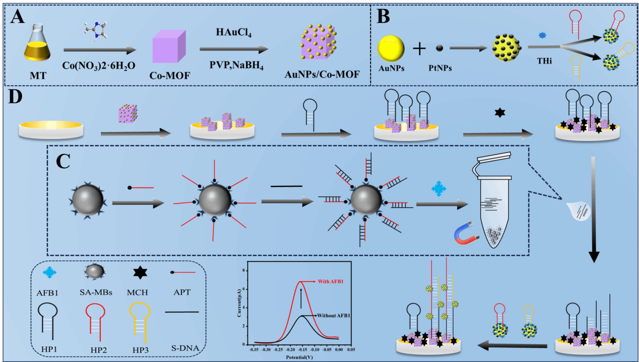粮食谷物是中国的主要食品,然而这类食品在加工或者储藏过程中很容易受到真菌毒素的污染。真菌毒素的种类有400多种,在众多真菌毒素中,黄曲霉毒素B1 (Aflatoxin B1,AFB1) 是毒性最高的致癌物之一,AFB1的毒性是氰化物10倍、砒霜68倍,已被国际癌症研究机构(IARC)归为Ⅰ类致癌物。因此,迫切需要开发灵敏、有效的方法来分析污染样品中的AFB1。本文以金纳米粒子/钴基金属有机骨架(AuNPs/Co-MOF)为修饰材料,THi/Au@PtNPs作为信号探针,结合无酶信号放大策略,构建了一种检测AFB1的电化学适配体传感器。AuNPs/Co-MOF具有较大的比表面积和出色的导电性,可负载大量DNA链并增强硫堇(THi)氧化还原信号,从而显著提高信号响应。Au@PtNPs对THi具有很高的催化活性,同时提高了负载THi的效率,使THi的电化学信号得以放大。此外,无酶杂交链反应(HCR)信号放大策略在确保传感器稳定性的同时,还能引起强烈的电化学信号响应。