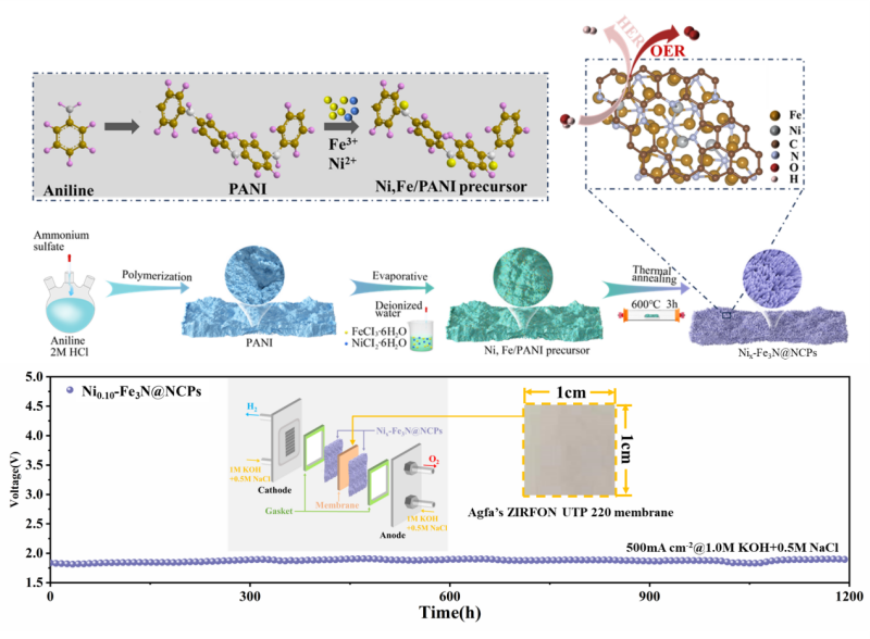相对于淡水,地球海水资源更为丰富,因此电解海水被认为是最有前途的制氢方法。本研究首先利用苯胺和过硫酸铵合成了PANI聚合物,在负载过渡金属后通过高温退火合成了HER/OER双功能电解海水催化剂Nix-Fe3N@NCPs。将Ni掺杂到Fe3N晶格中,两者可以产生协同效应,改变Fe3N的电子构型,加速其内部的电子转移。该催化剂中NPCs封装纳米层的存在不仅提高了导电性和结构稳定性,还有效抑制了海水中Cl-的传输和对电催化活性位点的毒害。在全解模拟海水测试中,仅需1.72V即可达到500 mA cm-2的大电流密度,并表现出优异的稳定性。另外,在零间隙碱性电解槽中,Ni0.10-Fe3N@NCPs电催化剂在1.80V的超低电压下即可实现 500 mA cm−2的电流密度并具有1200h的超长使用寿命。本研究工作为电解海水电催化剂的研究提供了前沿性的探索。
