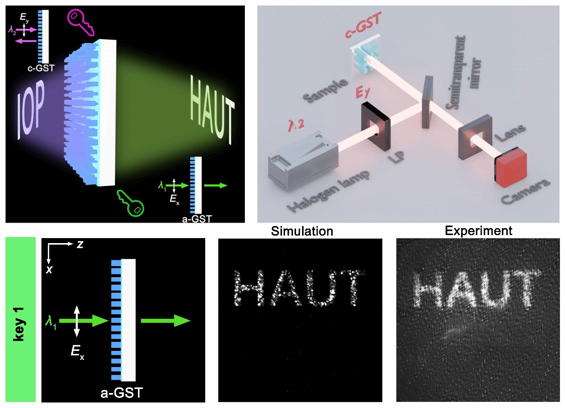 Janus超表面的设计灵感来自于罗马神话中的两面神Janus,可在不同的光线传播方向上显示出不同的波前调控。然而,传统的Janus超表面通常为多层结构,制备条件苛刻且不具备可重构性。鉴于此,作者基于相变材料GST提出了创新的解决方案,成功实现了两个出射方向的近场、远场成像,展示了可动态切换的非对称光场调控。在此基础上,进一步控制光线的方向和偏振状态,开发了一种具备四重密钥的光学加密技术,创建了仅在特定光学参数下才能解码的图像,从而大大提高了安全性。这项研究在图像显示、信息加密、数据存储等领域具有广泛应用前景。