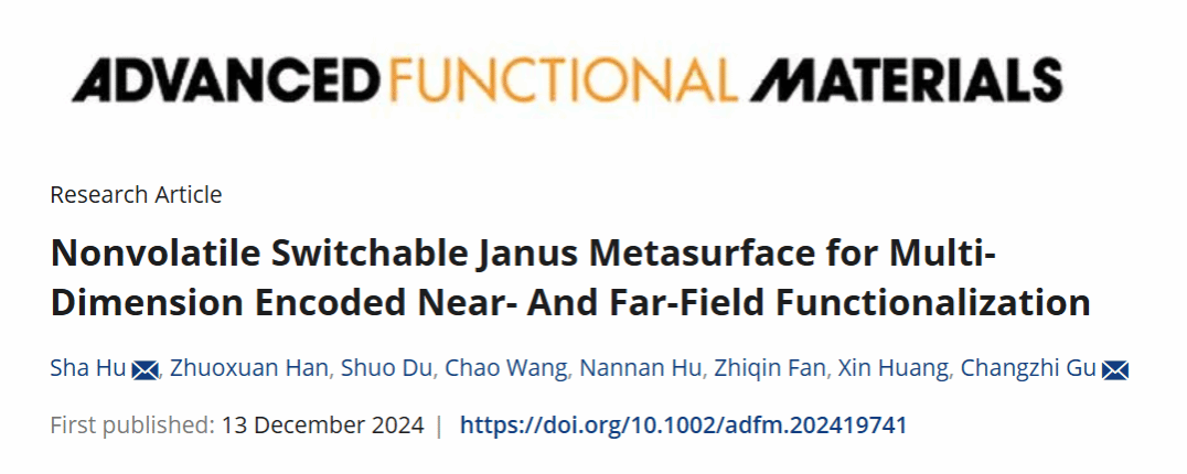近日,我校物理学院青年教师胡莎博士在材料科学领域国际顶级学术期刊《Advanced Functional Materials》(中科院一区TOP,IF = 18.5)上发表了题为“Nonvolatile switchable Janus metasurface for multi-dimension encoded near- and far-field functionalization”(DOI: 10.1002/adfm.202419741)的研究型论文。胡莎博士为论文的第一作者兼通讯作者,硕士研究生韩卓轩为第二作者,中科院物理所顾长志研究员为共同通讯作者,河南工业大学为第一署名单位和通讯单位。