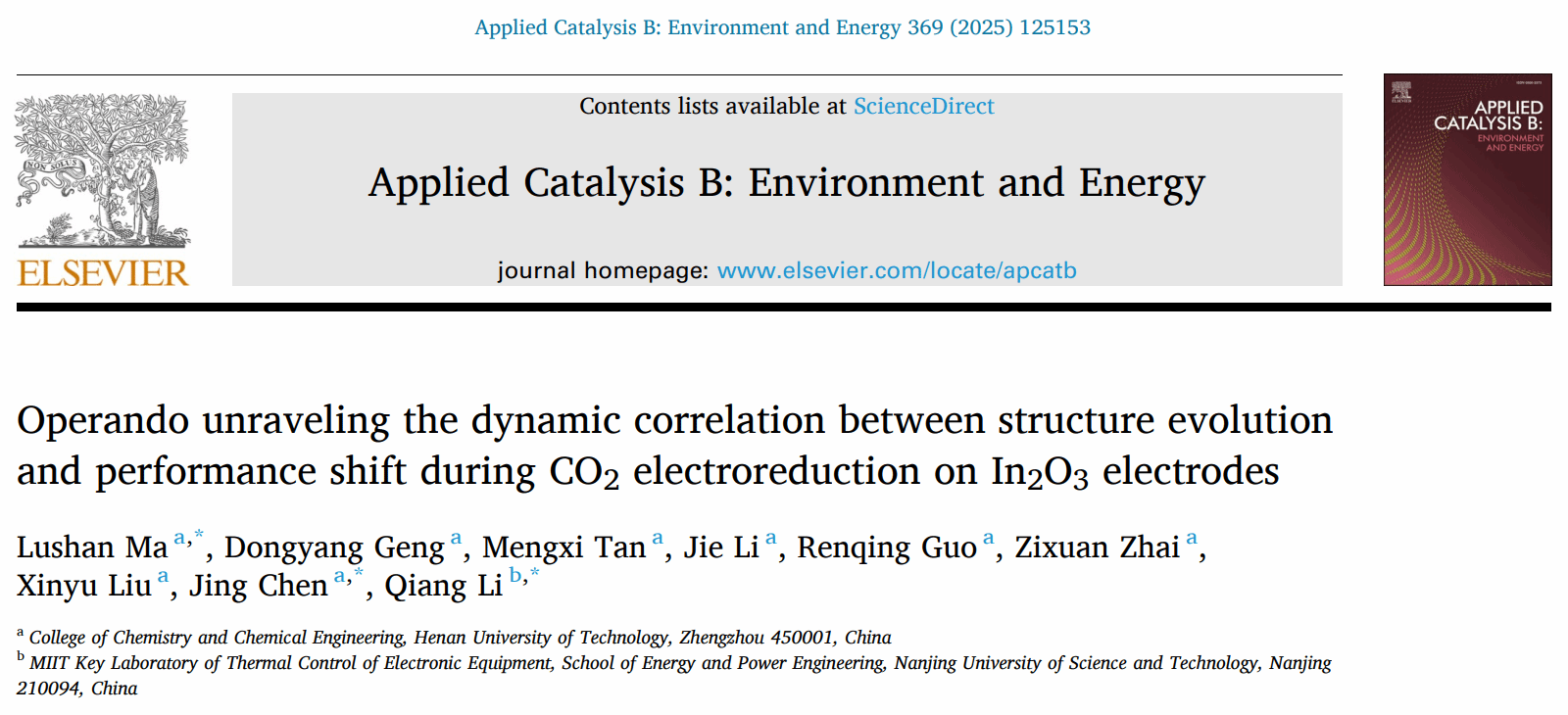 近日,化学化工学院清洁能源转化与高效利用团队在国际著名学术期刊《Applied Catalysis B: Environment and Energy》(影响因子IF = 20.3)发表题为“Operando unraveling the dynamic correlation between structure evolution and performance shift during CO2 electroreduction on In2O3 electrodes” (DOI: org/10.1016/j.apcatb.2025.125153)的研究性论文。我校青年教师马路山博士为该论文的第一作者和通讯作者,硕士研究生耿冬阳为第二作者,团队陈静教授和合作单位南京理工大学李强教授为共同通讯作者,河南工业大学为第一署名及通讯单位。