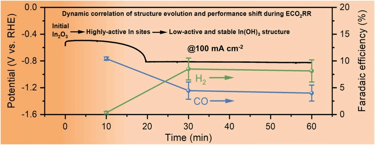 电催化二氧化碳还原反应(ECO2RR)是一种利用可再生能源将CO2转化为高附加值化学品和燃料的极具潜力的途径。铟(In)基催化剂,尤其是In2O3,在选择性CO2转化制备甲酸/甲酸盐方面展现出巨大潜力,但其在ECO2RR过程中催化性能变化与动态结构之间的关联尚未被充分研究,这限制了对In2O3催化剂结构-性能内在关系的全面理解。本研究以In2O3气体扩散电极为研究对象,借助原位拉曼光谱和XRD技术,揭示了In2O3在催化过程中“从In2O3到In再到In(OH)3”的结构演变及其与性能之间的动态构效关系。研究还发现,大电流电解会引发In2O3电极的剧烈重构和亲水性转变,从而显著抑制CO2还原选择性。团队创新性地提出一种通过小电流预演化构建稳定多孔In(OH)3催化界面的策略,使得在500 mA cm-2的电流密度下,甲酸盐法拉第效率达到88.7%,远高于初始样品的19.6%。该成果不仅阐明了In2O3催化剂的原位动态构效关系,更为设计高效稳定的电催化体系提供了理论指导,有望推动CO2转化技术向工业化应用迈进。