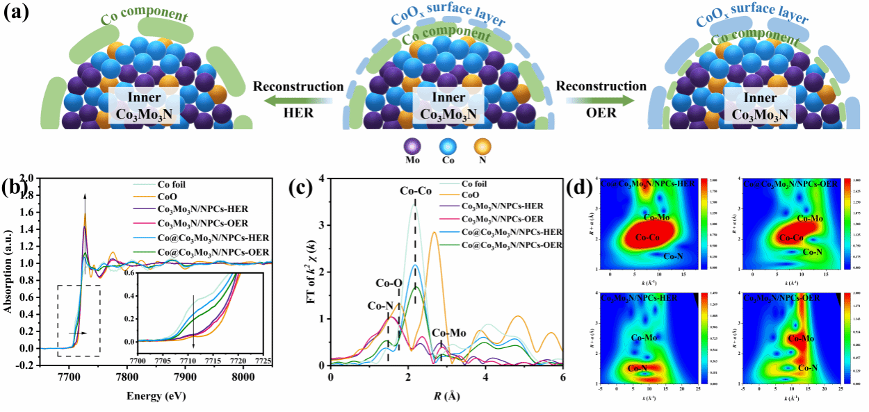 Co@Co3Mo3N/NPCs在HER和OER过程中表面重建过程的概念图和同步辐射表征测试