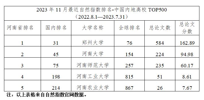近日,自然指数(Nature Index)官网更新了最新的一期自然指数排名,统计时间节点为2022年8月1日至2023年7月31日,我校排名居河南省高校第4位,国内198位,全球815位。与上一年相比(统计时间节点为2021年8月1日至2022年7月31日),我校省内排名从第17位上升到第4位,提升了13位;国内排名从342位上升到198位,提升了144位;全球排名从1623位上升到815位,提升了808位;论文总分数从1.31上升到8.61,提升了7.3。各项指标较上年同期有了大幅度提升,标志着我校在学科基础研究领域取得了突破性进展。