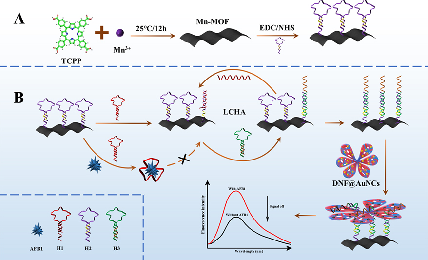 本工作还利用锰金属有机框架修饰的发夹DNA实现了目标的特异性识别及催化发夹组装的信号放大。该传感器在AFB1检测方面表现出了卓越的性能,具备良好的特异性、稳定性、再现性,检测限低至7pg/mL,并成功应用于真实样品中AFB1的检测。进一步扩展了DNA纳米结构在食品安全检测领域的应用并为AFB1的灵敏检测提供了行之有效的方法。
