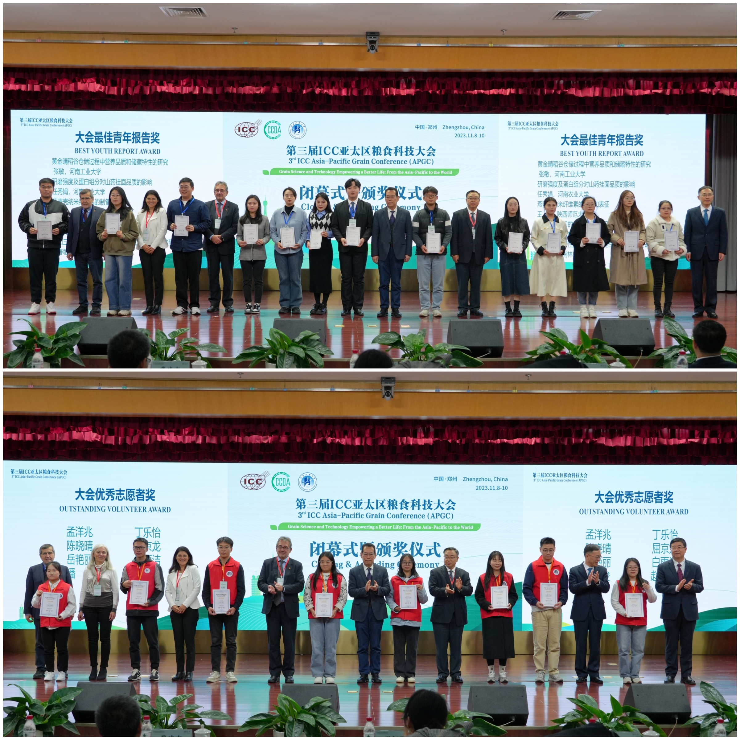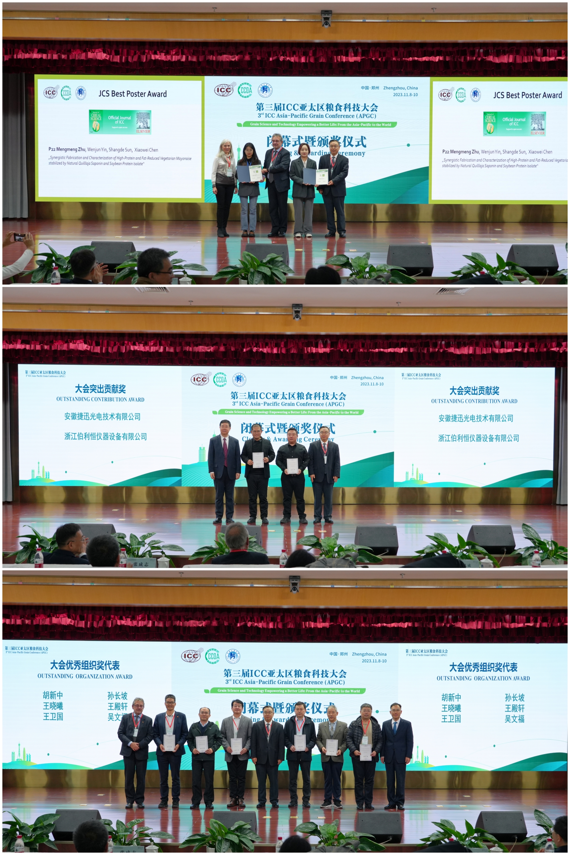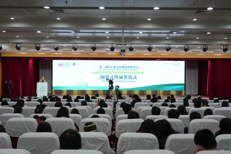 11月10日,大会举行闭幕式。中国粮油学会理事长卢景波,小麦和玉米深加工国家工程研究中心主任、中国粮油学会副理事长李成伟,国际谷物科技协会(ICC)主席Gerhard Schleining,我校党委书记刘志军,国际谷物科技协会(ICC)国家会员代表、河南工业大学教授卞科,中国粮油学会副理事长兼秘书长张成志,国际谷物科技协会(ICC)秘书长Veronica Haslinger等领导和学者出席大会闭幕式,并为大会各项荣誉获奖单位和人员颁奖。
