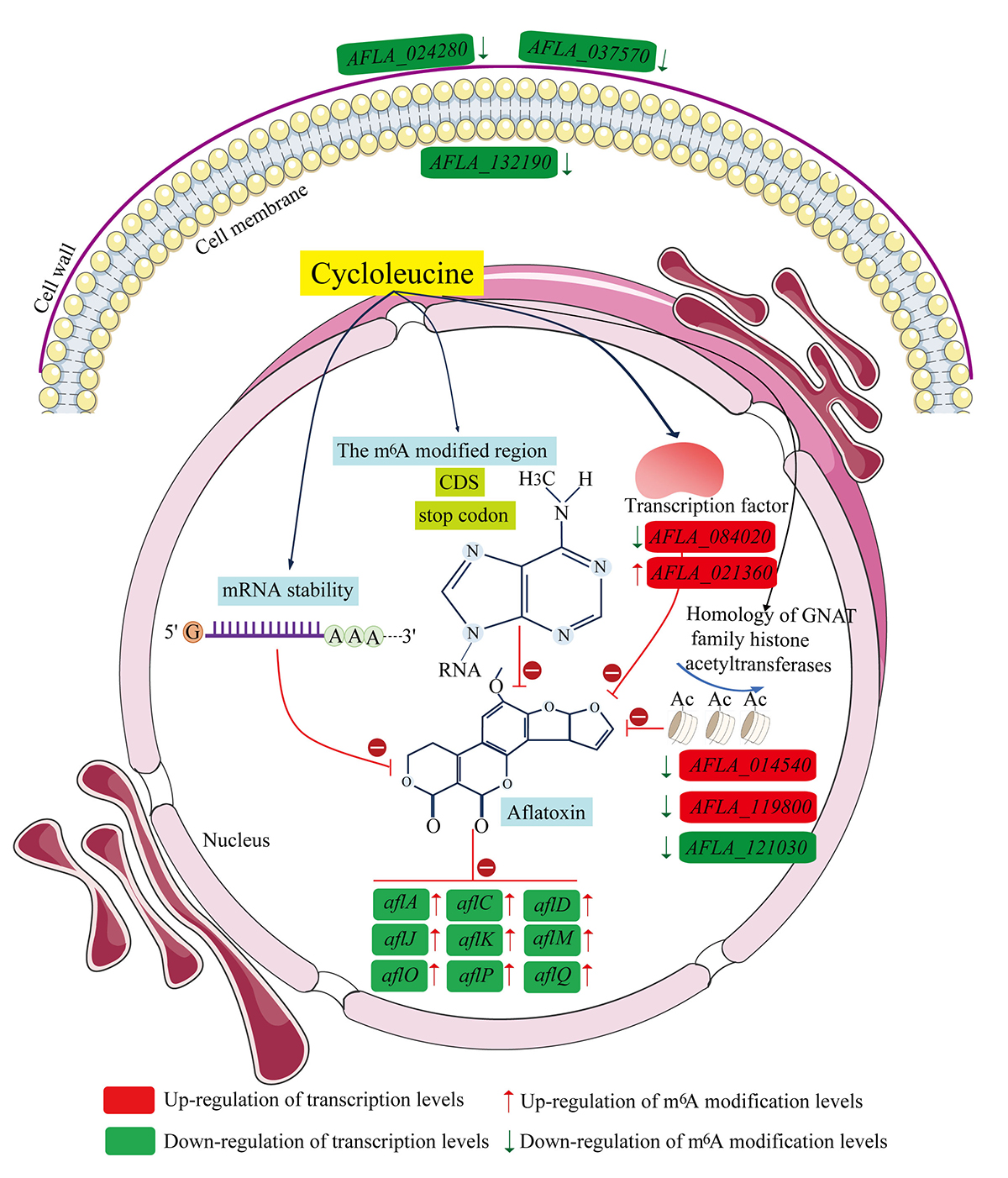 环亮氨酸通过m6A甲基化修饰调控黄曲霉毒素B1生物合成的机理图