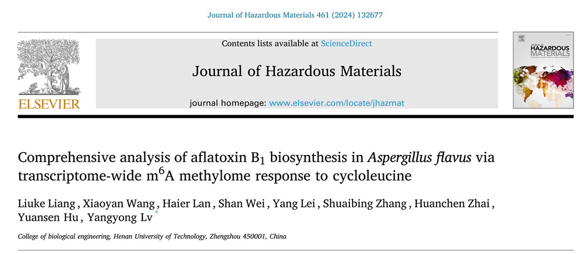 近日,我校生物工程学院粮油食品微生物危害防控团队吕扬勇课题组在国际顶刊《Journal of Hazardous Materials》(中科院一区TOP,IF=13.6)上发表了题为“Comprehensive analysis of aflatoxin B1biosynthesis inAspergillus flavusvia transcriptome-wide m6A methylome response to cycloleucine”的研究论文。该团队2021级硕士研究生梁柳柯为论文第一作者,吕扬勇为通讯作者,河南工业大学为第一署名单位和唯一通讯单位。