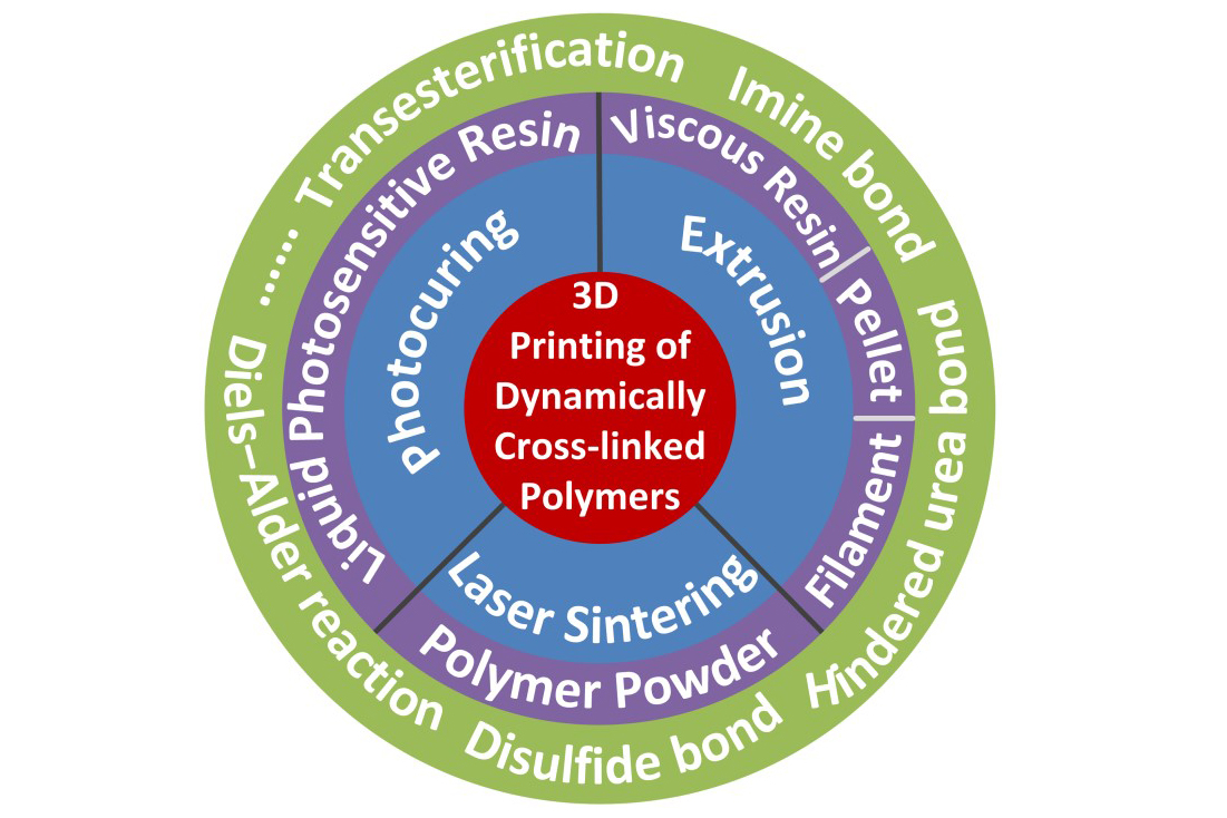 动态共价交联聚合物的发展对于解决日益严重的塑料污染和化石资源消耗问题具有重大意义。在过去十多年中,尽管在该领域取得了令人瞩目的研究进展,但目前仍然主要局限于学术研究阶段。先进材料加工技术是连接学术研究与实际应用的桥梁。作为一种独特的材料加工技术,3D打印能够在无需模具的条件下以逐层的方式创建复杂的三维形状,将动态共价交联聚合物与3D打印技术相结合,对于推动其进一步发展与应用具有重大意义。结合近年来的代表性研究工作,该论文从三个方面详细概述了该领域的发展:(1)与动态共价交联聚合物相适应的3D打印技术(光固化、挤出和激光烧结)的基本原理;(2)动态化学反应在3D打印过程中如何演变;(3)材料设计、3D打印过程与打印制品性能间的相互关系。最后,对如何进一步提高可打印性、材料性能、打印效率等问题进行了详细分析,并提出了解决这些问题的潜在方向。