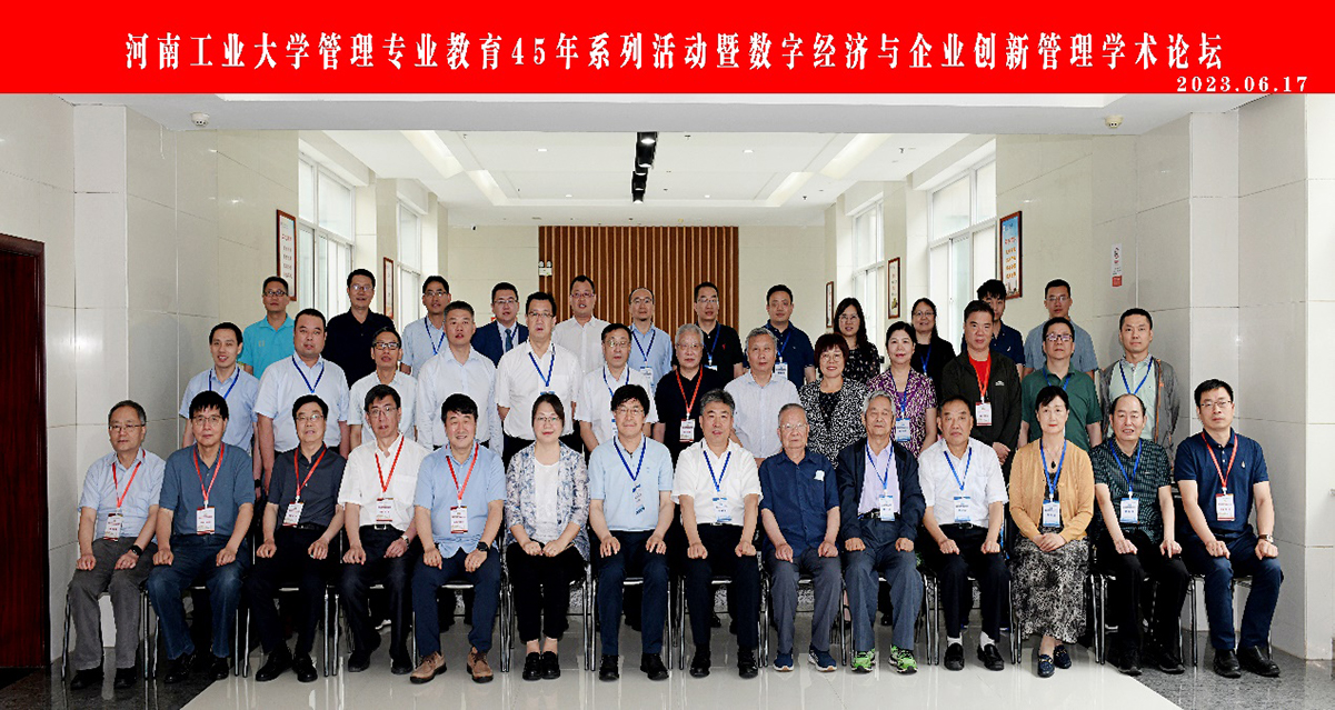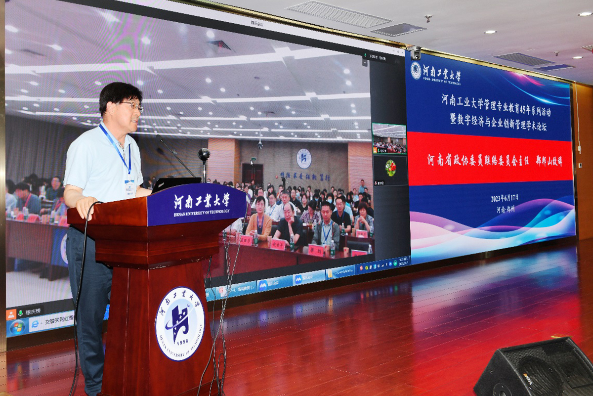 四十五载风雨路,不忘初心铸辉煌。6月17日,由管理学院主办的河南工业大学管理专业教育45年系列活动暨数字经济与企业创新管理学术论坛在学术报告中心D205成功召开,本次论坛采取线上线下相结合的方式举行。河南省政协委员联络委员会主任郑邦山,河南财经政法大学党委书记、校长司林胜,河南工业大学副校长陈桂香,中国社会科学院、南开大学、哈尔滨工业大学、首都经济贸易大学、西安理工大学、中央财经大学、北京师范大学等高校与科研院所的专家学者,国内部分优秀期刊社负责人,郑州大学、河南大学、河南科技大学、河南理工大学、华北水利水电大学、河南财经政法大学、郑州轻工业大学、郑州航空工业管理学院等省内高校兄弟学院领导,管理学院历任老领导、校友代表、师生员工代表等参加活动。论坛开幕式由管理学院党委书记魏明侠主持。