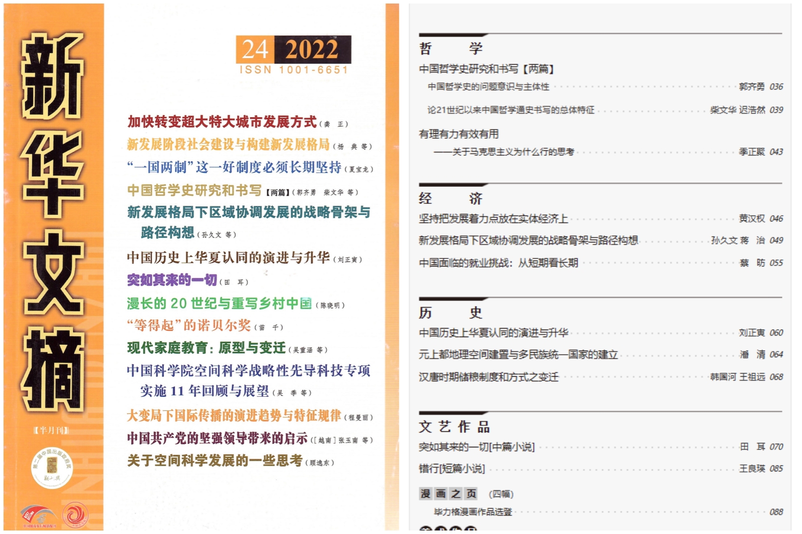 《新华文摘》创刊于1979年,由人民出版社主办,是我国最具影响的哲学社会科学文摘类杂志。其选登论文被国内各高校和科研院所认定为权威学术期刊,成为高校和科研机构学术评价的重要指标和依据。