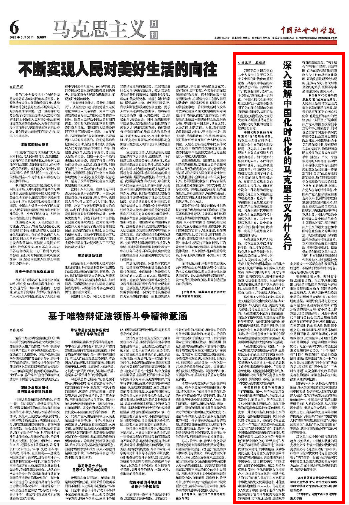 3月30日出版的《中国社会科学报》第六版“马克思主义月刊栏目”刊发我校马克思主义学院杨卫军教授的理论文章《深刻理解中国化时代化的马克思主义为什么行》。文章指出,习近平总书记在党的二十大报告中关于马克思主义中国化时代化的重要论述,具有极为丰富而深刻的思想内涵,其中两个“行”的重要论断,是对“三个为什么”理论的进一步深化。“中国化时代化的马克思主义行”这一最新论断指明了党的理论创新的空间向度和时间向度,表明了我们党坚定理想信念,把握历史主动,不断推进马克思主义中国化时代化的理论自信和历史自觉。文章提出中国化时代化的马克思主义为什么行,行在其科学性、人民性、实践性、开放性的理论品格、行在“两个结合”的根本途径、行在科学的方法论原则、行在胸怀天下的大格局大视野。