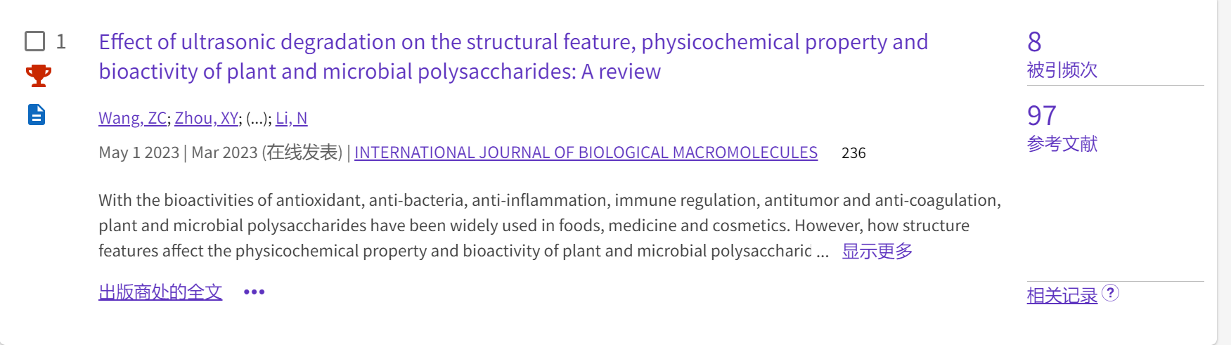 据2023年11月基本科学指标数据库(Essential Science Indicators,简称ESI)统计数据显示,河南工业大学生物工程学院王子朝副教授等于2023年03月发表于功能多糖领域《International Journal of Biological Macromolecules》(中科院一区,TOP期刊,IF=8.2)上的综述论文“Effect of ultrasonic degradation on the structural feature, physicochemical property and bioactivity of plant and microbial polysaccharides: A review”,被ESI数据库遴选为高被引论文。