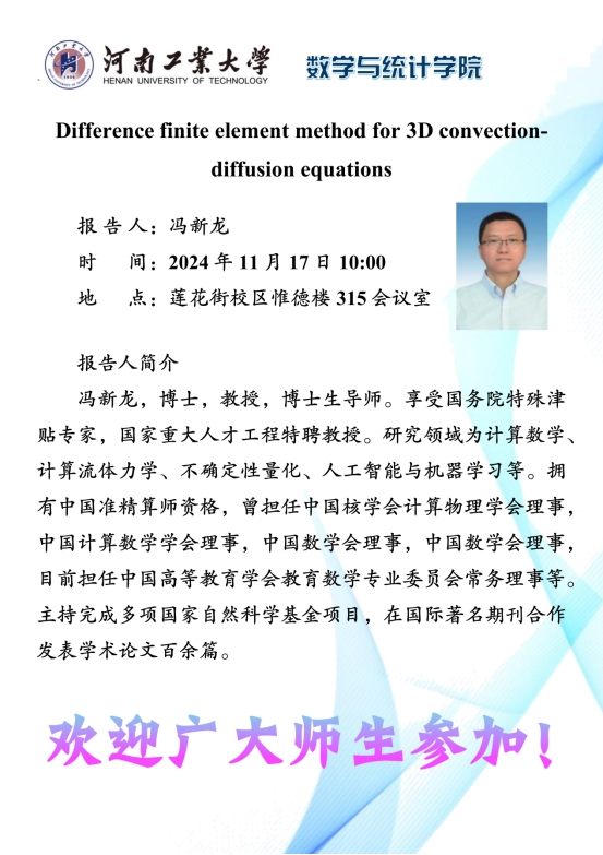报告人简介:冯新龙,博士,教授,博士生导师。享受国务院特殊津贴专家,国家重大人才工程特聘教授。研究领域为计算数学、计算流体力学、不确定性量化、人工智能与机器学习等。拥有中国准精算师资格,曾担任中国核学会计算物理学会理事,中国计算数学学会理事,中国数学会理事,中国数学会理事,目前担任中国高等教育学会教育数学专业委员会常务理事等。主持完成多项国家自然科学基金项目,在国际著名期刊合作发表学术论文百余篇。