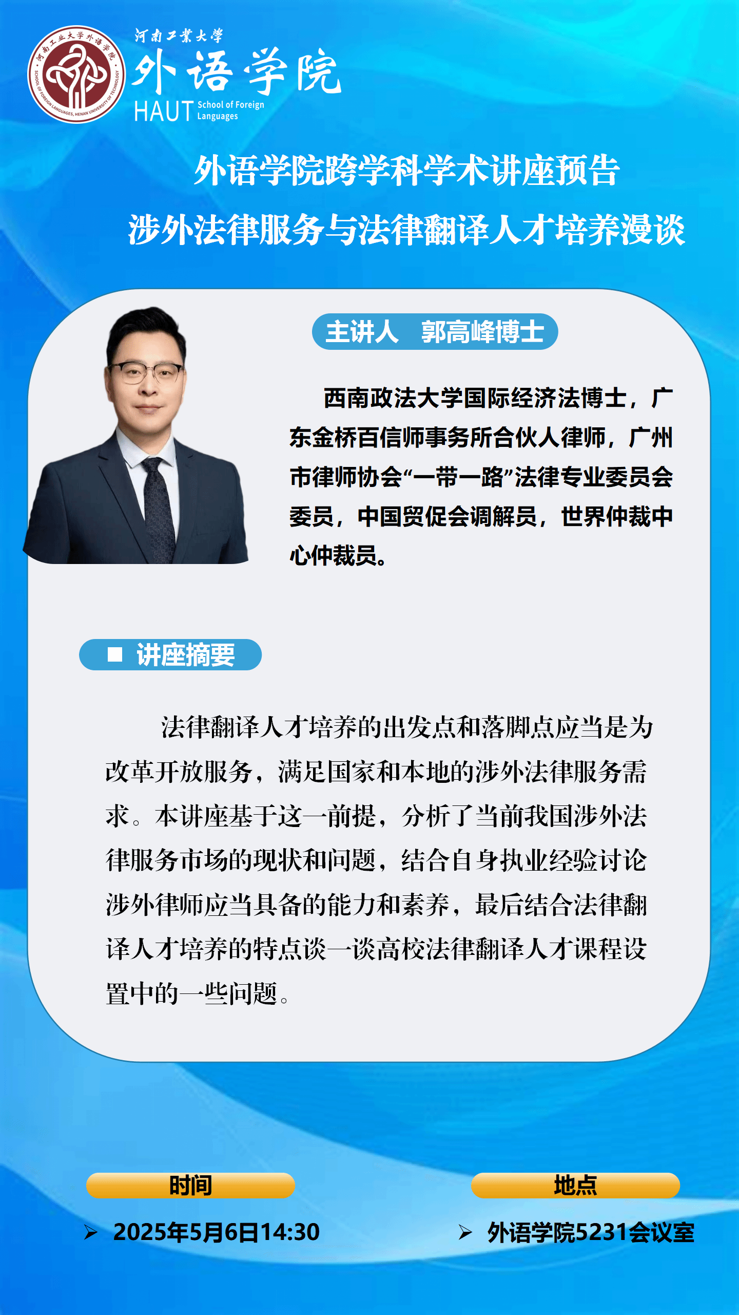 外语学院跨学科学术讲座预告:涉外法律服务与法律翻译人才培养漫谈